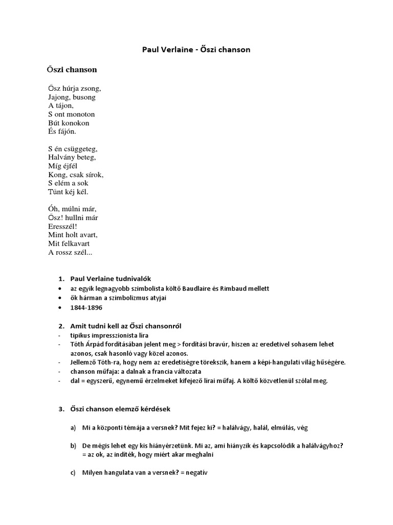 Paul Verlaine Oszi Chanson Elemzes Jegyzetek